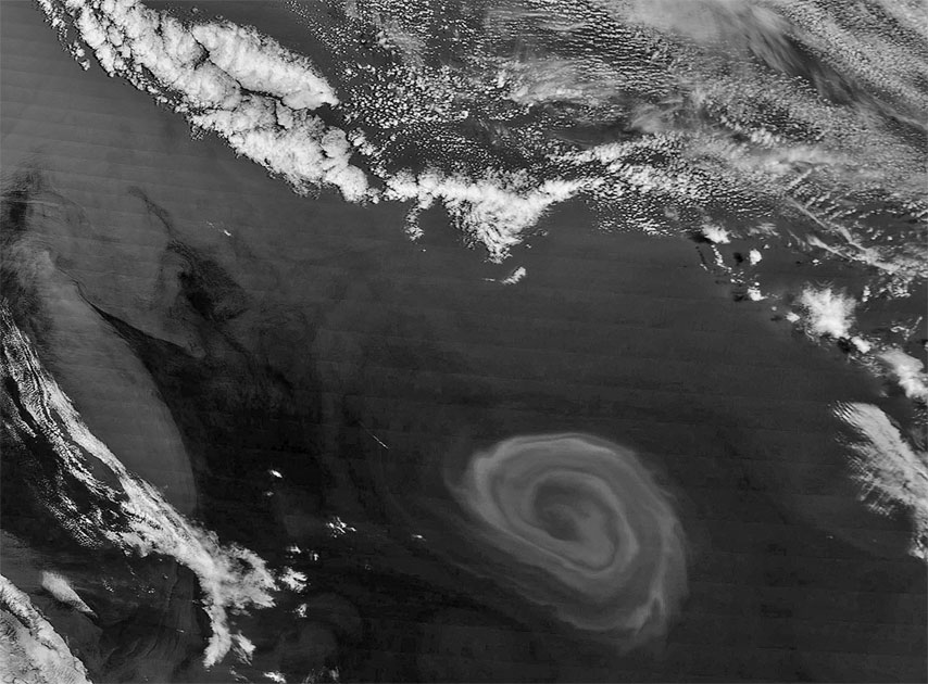 Рис. 1.16. Антициклонический вихрь (ринг) в океане размером примерно 150 км хорошо виден благодаря цветению фитопланктона. Он находится примерно в 800 км к югу от Южной Африки. По-видимому, вихрь отделился от течения Агульяс, направленного на юг вдоль восточного побережья Южной Африки. Вихри Агульяс важная составляющая в переносе энергии и вещества из Индийского океана в Южный. Фото: NASA