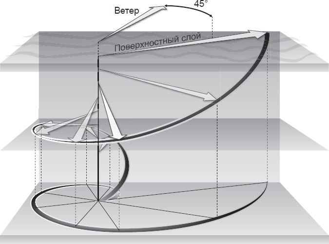 Это явление обнаружил норвежский полярный исследователь Нансен во время знаменитого дрейфа «Фрама». Он заметил, что движение корабля, вмерзшего в дрейфующий лед, отклоняется вправо на 2040° от направления ветра. Объяснение этому явлению дал шведский океанолог Вагн Экман (18741954). Поверхностный слой воды приводится в движение ветром. Движется он медленнее, чем ветер, а значит, отклоняется силой Кориолиса сильнее. Верхний слой воды приводит в движение слой нижележащий, тот следующий, благодаря чему отклонение от первоначального направления с глубиной усиливается (рис. 1.13).