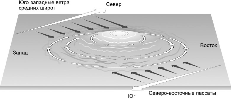 Рис. 1.14. Образование океанических круговоротов в Северном полушарии. В результате экмановского переноса в центре круговорота уровень океана поднимается, и формируется водяная линза. Вода движется под действием разности давлений из-за наклона поверхности и силы Кориолиса