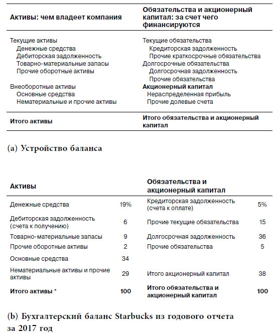 Таблица 13 поможет вам в анализе: в ней приведен типовой баланс, а также баланс глобальной розничной сети Starbucks за 2017 год. В левой половине («Активы») в таблице 13 (b) перечислено всё, чем Starbucks владеет, а в правой половине («Обязательства и акционерный капитал») обозначено, как эти активы финансируются. Таким же образом можете составить ваш личный баланс: в нем будет одежда, стиральная машина, телевизор, автомобиль или дом это активы. Любая ваша задолженность это обязательство, а всё остальное акционерный капитал[2].