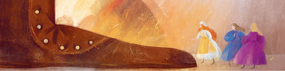 Людоед поразмыслил и согласился с женой. Баба повела его в погреб. Бедные девушки решили, что им конец, великан пришёл их съесть. Завидев людоеда, бедняжки упали на колени и стали молить не убивать их.
