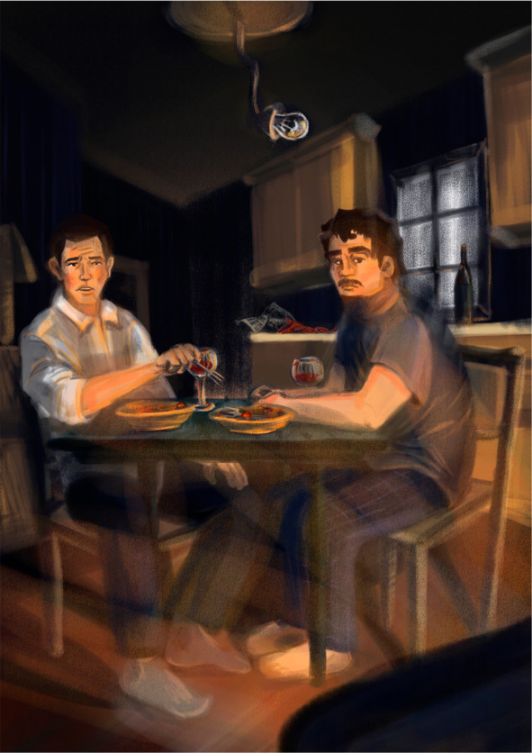 Внезапно на стол приземляется тарелка со спагетти, политая соусом и с разрезанными помидорами, что лишний раз подчеркивает скудные поварские качества Фила. Сосед сел напротив и после того, как отпил красное вино, наконец поинтересовался касаемо газеты.