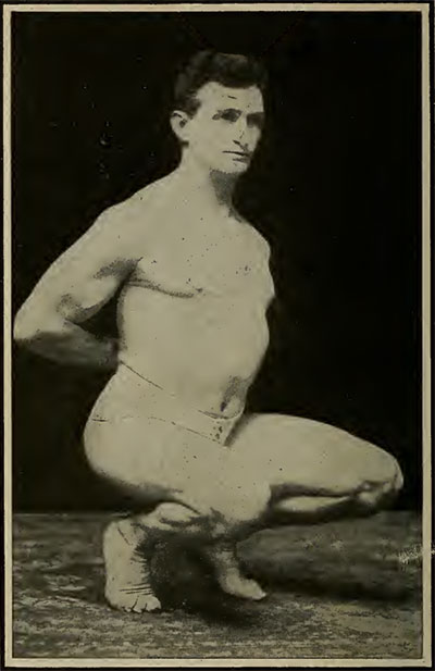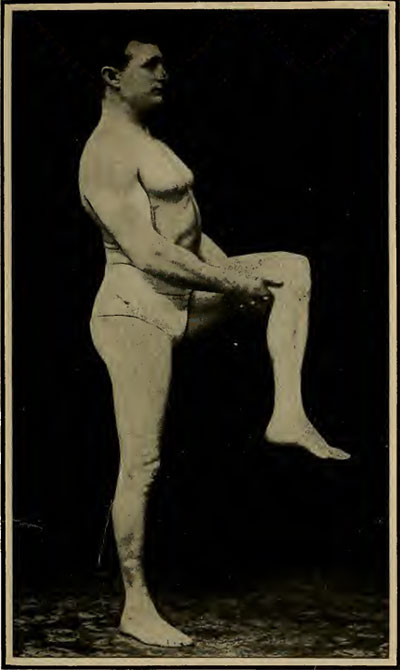 Встаньте прямо, позвоночник жесткий и прямой, насколько это возможно. Поднимите левую ногу вверх, сгибая колено и захватывая ногу почти под коленом, как показано на рисунке. Теперь поднимите ногу как можно выше, просто согнув руки в локтях. Это необычайно ценное упражнение для развития бицепсов и других мышц верхней части руки. Движение следует продолжать до наступления усталости. Используемая нога должна меняться слева направо в разное время, когда выполняется упражнение.