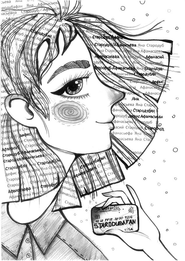 За девять лет я стала умнее, теперь произношу чётко и конкретно: «Яна. Юрьевна. Стародуб. Дефис. Афанасьева». Большинство уточняют: «Ну, в смысле чёрточка?». Желающие блеснуть умом спрашивают: «Через тире, то есть?». Желающие блеснуть умом и сообразительностью после вопроса про чёрточку решают, что чёрточка неважно, в какую сторону чёрточка, и рисуют «/»: то есть получается «Стародуб/Афанасьева», вроде как на выбор Стародуб или Афанасьева.