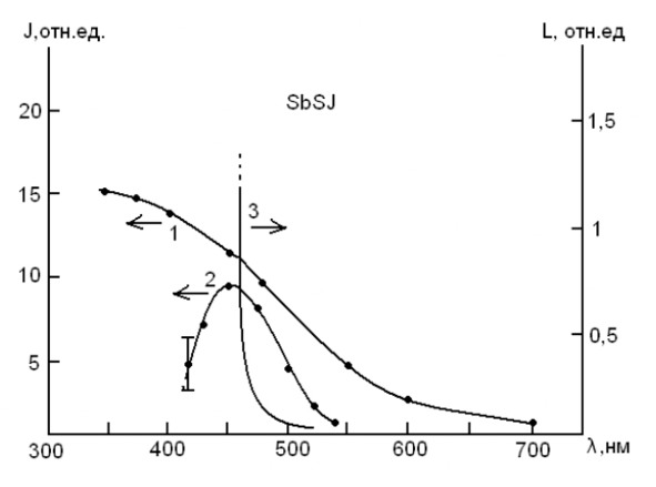 Measurements were carried out for SbSI single crystals in the ferroelectric phase at a temperature of T = 133 K. The crystal was illuminated by plane polarized light using a xenon lamp and a ZMR monochromator. The stationary photovoltaic current J was measured by the method previously described [1]. In accordance with the SbSI symmetry (point group mm