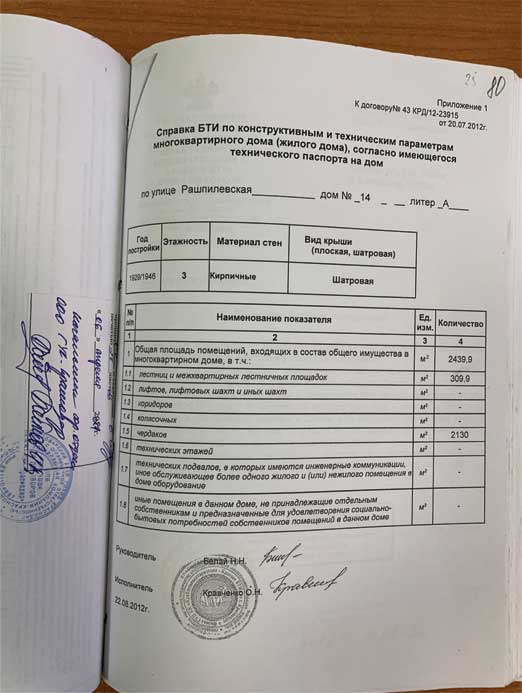 Заметим в данной связи, что в материалах дела также имеется уже не письмо уровня переписки руководителей организаций, но официальная справка, выданная краевым БТИ все в том же 2019 году[79], в которой ясно записано, что «в МОП к ул. Рашпилевской, 14 входят лестничные клетки лит а, а1, а2 общей площадью 58,2 м2, над которыми нет чердака, а также этажность дома: 2 этажа»[80].