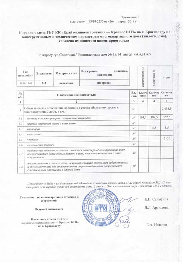 Кроме того, ГБУ КК «Краснодарская техническая инвентаризация краевое БТИ» отдел по городу Краснодару в письме с исх. 13.1805/1616 от 06.08.2019 разъясняет, что общая площадь лестниц и лестничных клеток многоквартирного дома литер «А», расположенного по адресу: г. Краснодар, ул. Рашпилевская/Советская, д.14/35, в справке БТИ по конструктивным и техническим параметрам многоквартирного дома от 22.08.2018[77] указана из материалов инвентарного дела и составила 309,9 кв. м, и в общую площадь лестниц и лестничных площадок многоквартирного дома литер «А» не входили пристройки литер «а», «а
