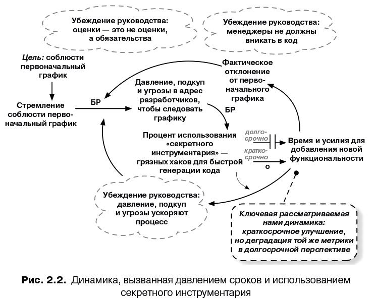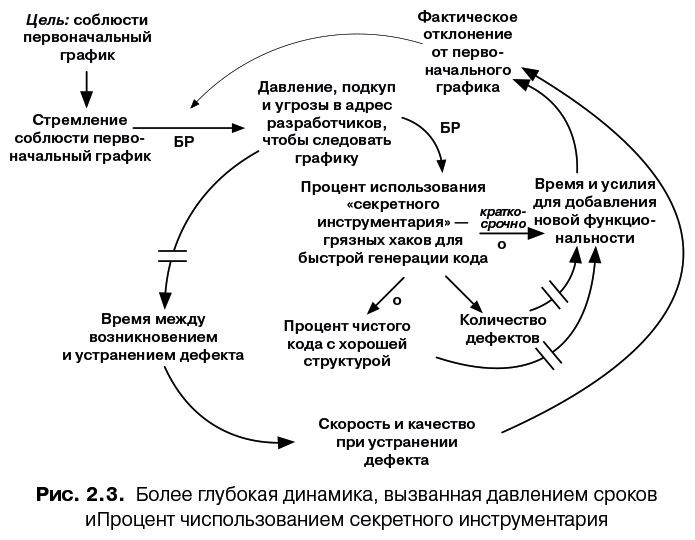 Рис. 2.2. иллюстрирует базовую динамику того, что происходит, когда менеджеры давят на людей с целью соблюсти первоначальный график, и почему такое «быстрое решение» проблемы медленного прогресса в краткосрочной перспективе вроде бы ускорило работу команды, но в долгосрочной замедлило ее еще больше. В этой модели мы частично опустили более глубокую динамику, которая будет рассмотрена дальше и представлена на рис. 2.3.