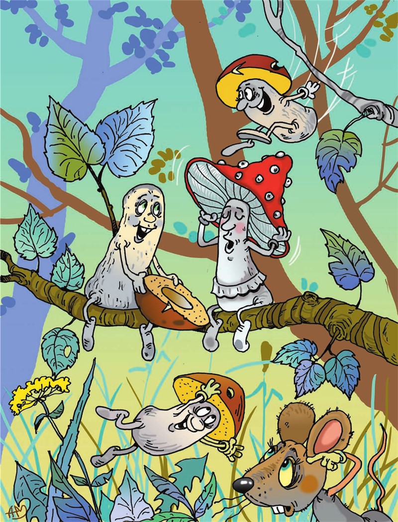 В неправильном лесу водятся и грибы. Только не на земле, а на деревьях. И не сидят на одном месте, а прыгают с ветки на ветку, как бе ́лки в правильном лесу. Там же, на деревьях, они вьют себе гнёзда навроде птичьих в них и живут.