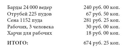 На 100 быков, откармливаемых на барде, потребно для присмотра помимо приказчика 3 человека батраков; цена каждому батраку 10 рублей на хозяйских харчах. Принимая во внимание все эти издержки, получим следующую цифру расходов, потребных ежемесячно по откармливанию бардою 100 быков: