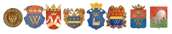 Ряд многонациональных гербов Выборга. Герб со слоном учрежден Петром I в честь доставки новгородцами, по Волге из Индии, боевого слона союзным датчанам.