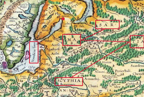 Карта Авраама Артелиуса 1689 год. Побережье Венедского моря населяют с севера Сарматы, на южном берегу Скифы, Агафирсы, Скрифины. На берегах Финского залива Панония и Гарда (Гардарика). Если считать, что автор изобразил прошлые века, географическая ситуация показана на XVIXVII века.