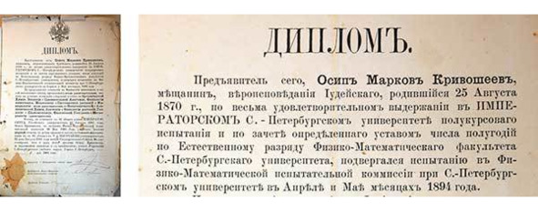 Осип Маркович Кривошеев выпускник Санкт-Петербургского университета. 1894 г.