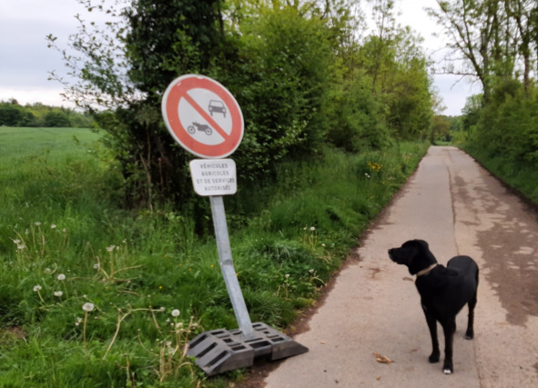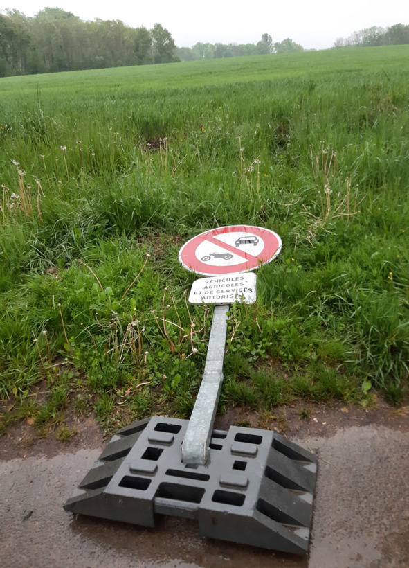 Этот знак дорожного не-движения вандалы местные (а кто, кроме них, забредёт в эти поля?!?) постоянно ломают Понятно, что дорожка эта очень удобно соединяет накоротке две деревни, и две важные авто-артерии на ФернЭ и Женеву, а иначе на автотранспорте по нормальным дорогам надо ехать раза в три дольше и дальше