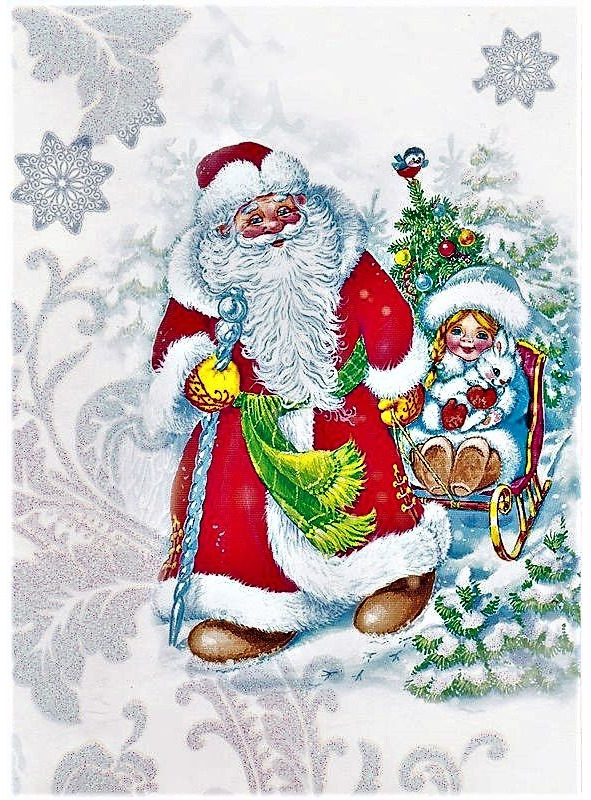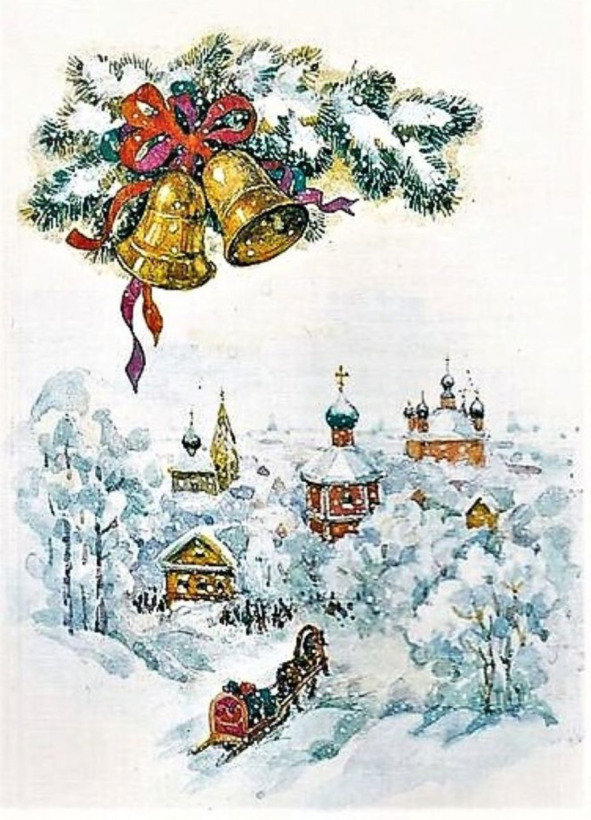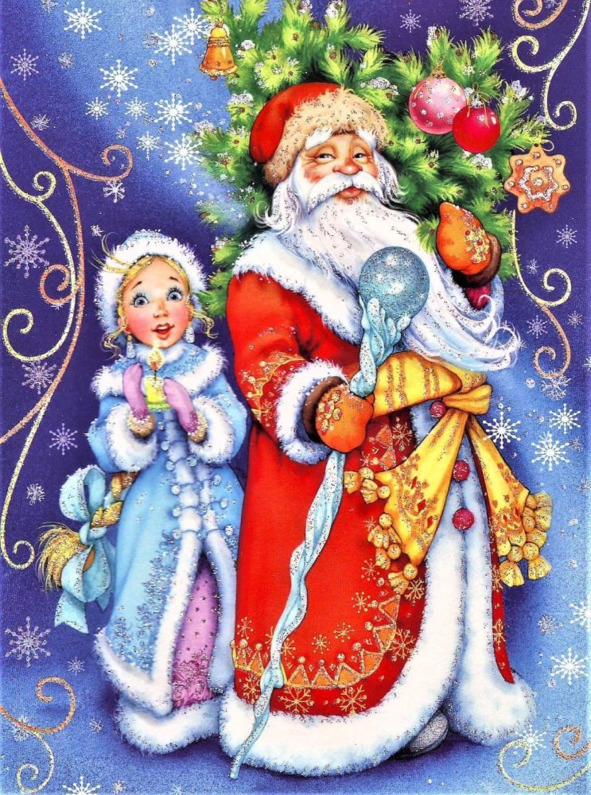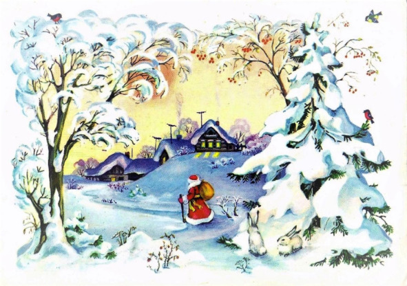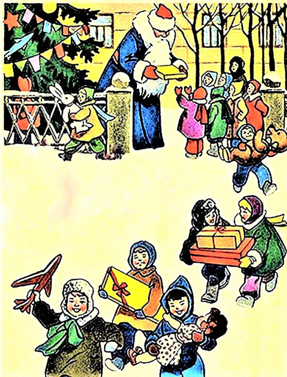 Дед Мороз садился в сани и ехал под серебряный звон золотого колокольчика по деревне. Из домов высыпал народ в праздничных костюмах, кто с гармошкой, кто с балалайкой, а кто и с дудкой. И начиналось веселье. Задорно играла музыка, лихо отплясывали танцоры, звонко звучали песни. Дети выступали перед Дедом Морозом: читали ему стихи, пели, плясали, играли. И он в подарок давал им чудесные игрушки. А когда наступал вечер, Дед Мороз скрывался со своими необыкновенными санями в глубине леса, а счастливые ребятишки, простившись с ним, бежали домой поделиться радостью новогодними подарками.