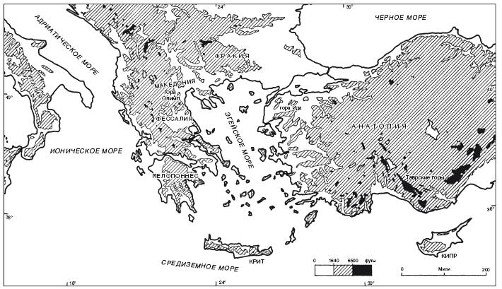 Внешне полоса прибрежной земли, известная нам сейчас как западная часть Турции, и находящиеся в прибрежной акватории крупные острова, до сих пор принадлежащие Греции, очень похожи на саму эту страну, лежащую на противоположном берегу Эгейского моря, но для них (особенно для расположенной в центре Ионии) характерен более мягкий климат. Греков влекла эта местность, простирающаяся на довольно большое расстояние от долин крупных рек. Однако, поднявшись на центральное плато Анатолии, можно увидеть другой, гораздо менее гостеприимный мир, который находился под влиянием эллинов, но не был заселен ими вплоть до походов Александра Македонского. К северу от Эгейского моря лежало побережье Фракии, более суровая, но относящаяся к сходному типу местность. Она привлекала греческих поселенцев, однако им так и не удалось произвести впечатление на племена, жившие в местных горах. На юге из Эгейского моря выглядывает узкий и высокий остров Крит, а пробел между ним и Малой Азией частично закрывают острова Карпатос и Родос. На них греки также с удовольствием селились.