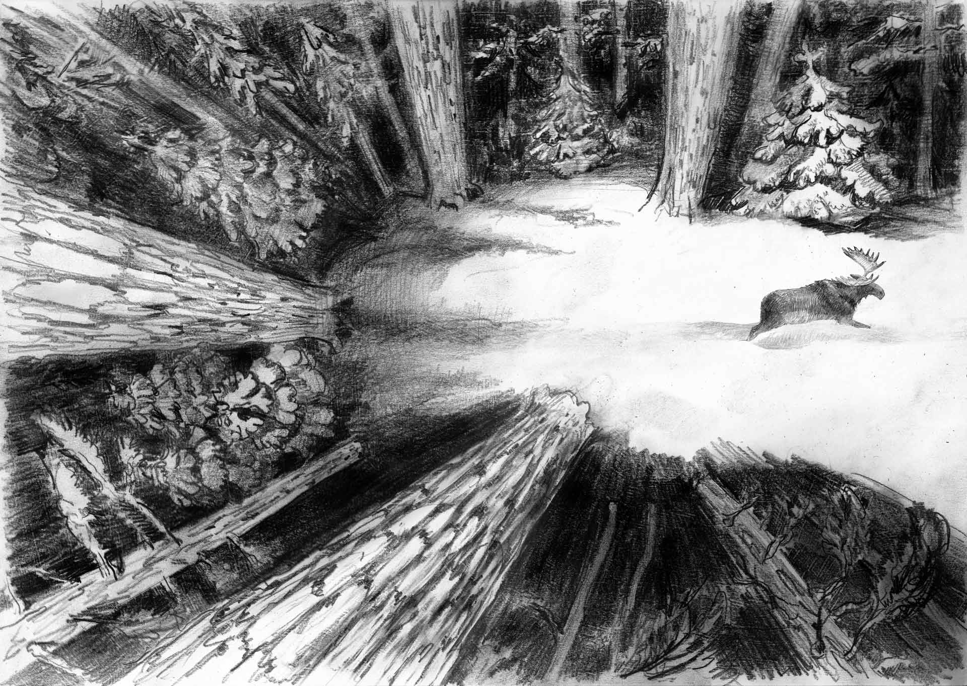 Глаза постепенно привыкли к темноте и проступили детали. Луна блуждала по тайге со своим огромным фонариком, наполняя туман внутренним светом, и тогда на блестящем белом снегу проявлялись вереницы следов, и становилось понятно, что лес не мертвый, он полон жизни. Совсем молодые ели, прибитые снегом, высовывали свои верхушки в белых шапках, а те, что постарше красовались в сверкающих нарядах почти во весь рост. Кусты, застывшим ледяным фейерверком, весело торчали из сугробов. Густой запах хвои создавал новогоднее настроение. Длинные размашистые тени танцевали на снегу, и казалось, будто в лесу кто-то водит хоровод у костра. Но когда рваное окно в громадном поле из облаков заканчивалось, и Луна не могла заглянуть сверху под покров, то лес превращался в жуткое место, где даже снег становился черным как смола.