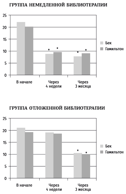 Далее исследователи сравнили значимость улучшения в группе библиотерапии с улучшением состояния пациентов, участвовавших в опубликованных исследованиях применения антидепрессантов, психотерапии и обоих методов. Так, в большом исследовании депрессии Национального института психического здоровья США отмечалось снижение уровня депрессии на 11,6 балла по шкале Гамильтона у пациентов, проходивших когнитивно-поведенческую терапию под наблюдением высококвалифицированных психотерапевтов в течение 12 недель. Похожее улучшение на 10,6 балла показали пациенты, прочитавшие «Терапию поведения» всего за четыре недели. Таким образом, уровень улучшения при лечении библиотерапией сравним с другими видами лечения, но, похоже, достигается намного быстрее. Мой личный клинический опыт это подтверждает. Очень немногие пациенты выздоравливают в течение первого месяца психотерапии.