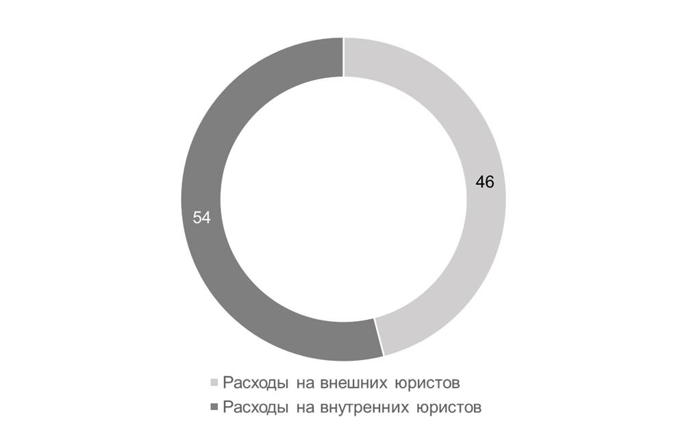 Что касается расходов на внешних юристов и на альтернативных провайдеров юридических услуг, то по данным CLOC (Corporate Legal Operations Consortium), приведенным в исследовании 2019 года5, за последние годы 22% опрошенных юридических департаментов увеличили эту статью расходов, в то время как 33% перевели больше работы в инхаус. По итогам проведенного исследования, у европейских и американских компаний, участвовавших в опросе, в 2018 году распределение расходов на внешних консультантов и на внутренних юристов было следующим: