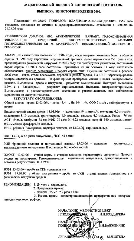 ральный порок сердца, диагностировали ревматизм сердечной мышцы, ишемическую болезнь сердца и другое тому подобное (рис. 5). Лечащий врач, женщина, при выписке, уже в коридоре лечебного отделения с нескрываемым сочувствием советовала примириться с создавшимся положением, не падать духом ведь оставшуюся часть жизнь предстояло провести в условиях существенных ограничений (в частности, физических нагрузок) и регулярного приёма лекарственных препаратов.