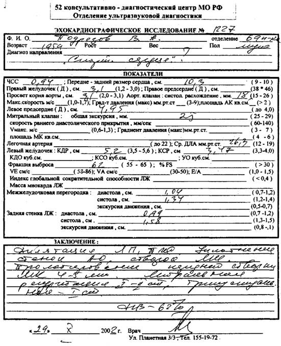 Эпизод первый, правда, растянувшийся на годы. Выше уже упомянул, что в сорок лет впервые столкнулся с «сердечной» проблемой, в результате чего попал в госпиталь, а именно в кардиологическое отделение филиала госпиталя имени Мандрыка, находящегося поблизости от места моего проживания и службы. Но там ничего серьёзного у меня не обнаружили (рис. 3), чему, собственно, и я, и жена несказанно были рады. Затем прошло почти три года, причём достаточно напряжённых, поскольку на них выпали завершение подготовки и защита моей докторской диссертации. В общем, на моей кардиограмме, сделанной осенью в период ежегодной плановой диспансеризации, обнаружились существенные нарушения. Эхограмма, снятая затем в Московском центральном диагностическом центре, куда меня направили на консультацию, лишь усугубила создавшееся положение (рис. 4). Врач, зафиксировавший наличие митрального порока сердца, делятацию левого желудочка и другие отклонения от нормы, посетовал, что пришёл я к нему слишком поздно: «А надо было бы ещё лет пять назад Так что ничего уже практически нельзя сделать, и признаки сердечной недостаточности: отдышка, отёки ног, боли за грудиной, придут совсем скоро и неизбежно». По результатам этой диагностики в начале 2003 года в плановом порядке был направлен в Центральный военный клинический госпиталь рода войск, в котором служил, располагавшийся тогда под Москвой в городе Одинцово. Там неприятные известия о моём здоровье только прибавились. На очередной эхограмме зафиксировали ещё и аорт-