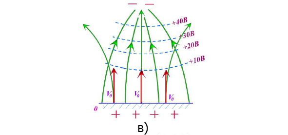 1.5-b-rasm. Elektronlarning bir jinsli bolmagan tezlatuvchi maydondagi xarakati.