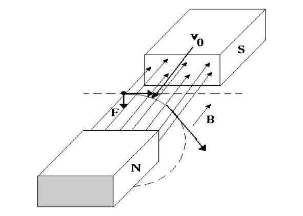 v0 boshlangich tezlikka ega bolgan elektron bir jinsli magnit maydonida kuch chiziqlariga tik ravishda xarakat qilsa, unga Lorents kuchi tasir qiladi.