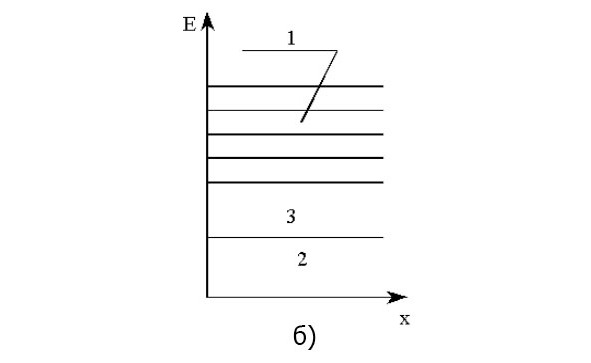 2.2-rasm. Energetik zonalarniki, a-oqekazgihlarniki; b-yarim-oqekazgihlarniki; c dielektriklarniki: 1 oqekazuvchanlik zonasi; 2 valent zona; 3 jamoa zonasi.
