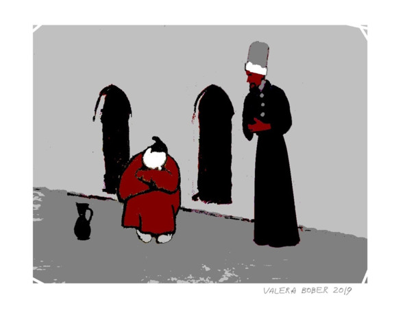 Яркий луч ударил сквозь окна и высветил стол, за которым сидел бородатый паломник и одетая в простое платье, женщина. Бородач пил из глиняной чаши вино, вытирал усы и икал, а женщина грустно улыбалась. Свет бросал на пол крестом тень от окна, и упирался в стену над ее головой, очерчивая ореолом волосы.