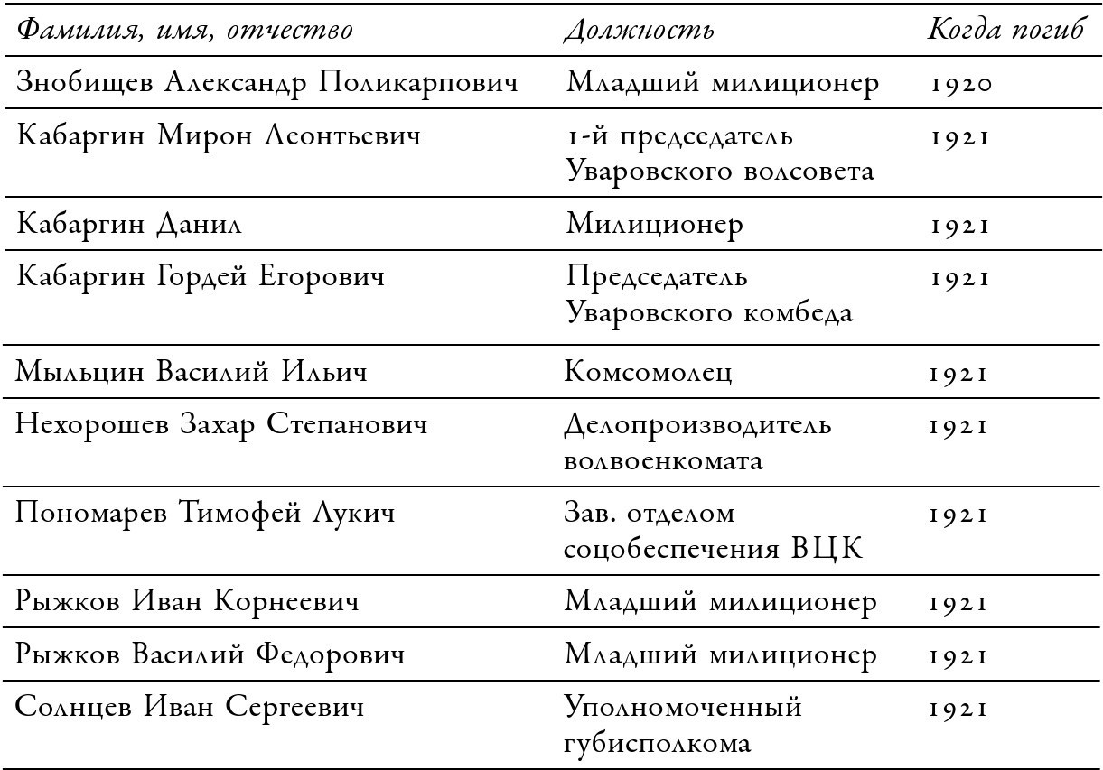 Первый документ, на котором мы остановим свое внимание, обозначен как «Список захороненных на Братском кладбище в Уварове» (далее «Список захороненных»). Неизвестно его точное происхождение, но некоторые его особенности (сведения оформлены в таблицу, данные структурированы, особенности авторского почерка) указывают на то, что его создателем мог быть А. И. Акиндинов. В список вошли десять фамилий, напротив каждой указаны год смерти и должность, которую занимал погибший при волостном управлении. Согласно этому документу, милиционер Знобищев Александр Поликарпович был убит «бандой» и захоронен на кладбище у церкви в 1920 году. Все остальные погибли в 1921 году. При этом только пятеро из них, исходя из воспоминаний участников подавления восстания, на которые опирался Акиндинов, были убиты во время январского вторжения повстанцев в Уварово.
