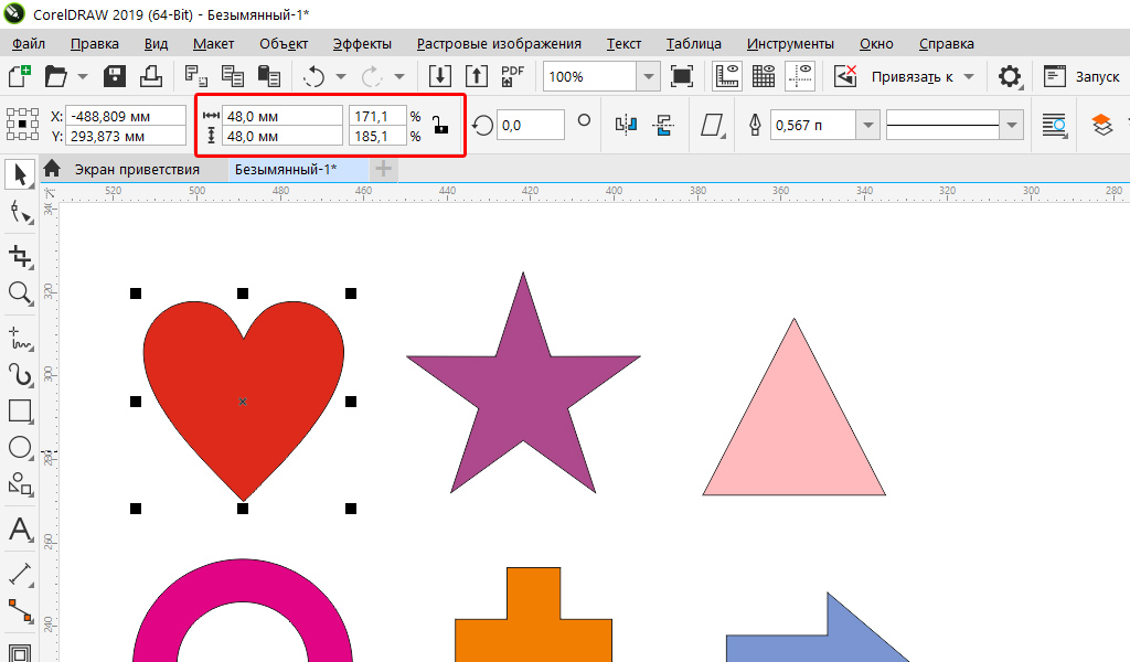 Первый параметр длина объекта, второй параметр ширина объекта. На рисунке 23 выделен инструментом «Указатель» объект «Сердечко» и на панели свойств отображаются его длина и высота.