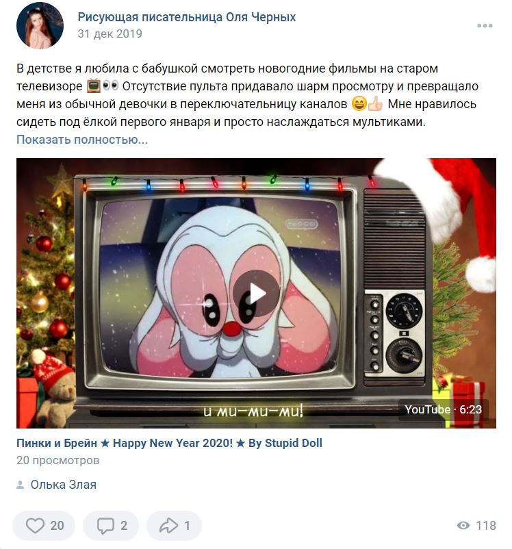 В детстве я любила с бабушкой смотреть новогодние фильмы на старом телевизоре. Отсутствие пульта придавало шарм процессу и превращало меня из обычной девочки в переключательницу каналов. Мне нравилось сидеть под ёлкой первого января и просто наслаждаться мультиками.