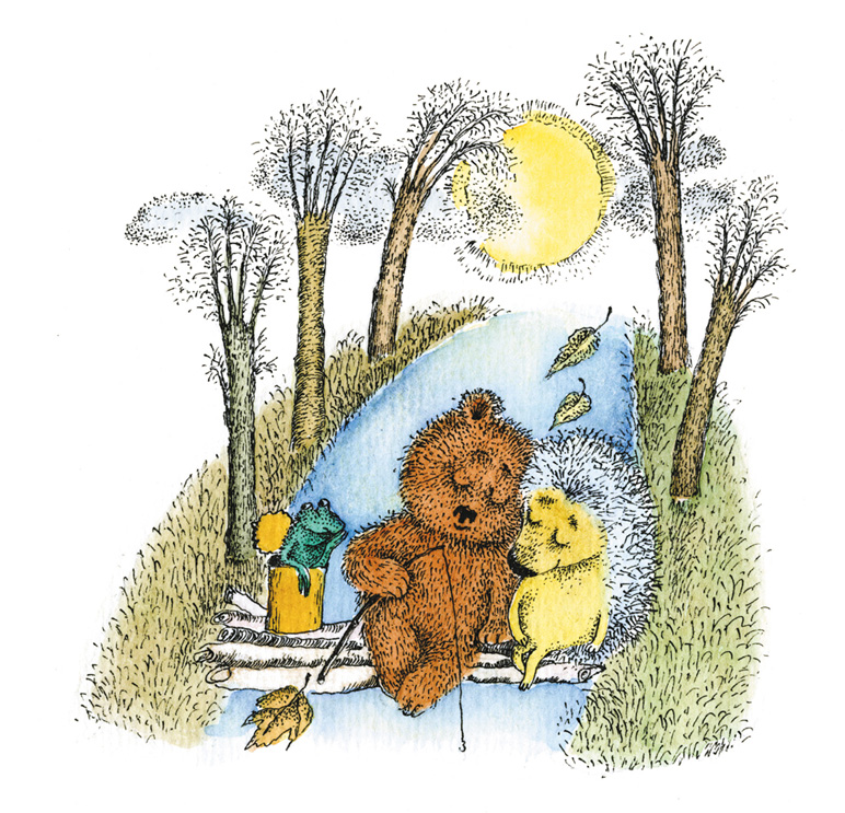 А перед рассветом, когда горох кончился, Медвежонок свесился с мостка и вытащил из воды два оранжевых кленовых листа.