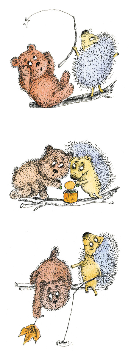 Они сидели на узеньком берёзовом мостке и смотрели в воду. Медвежонок смотрел на поплавок Ёжика, а Ёжик на поплавок Медвежонка. Было тихо-тихо, и поплавки неподвижно отражались в воде