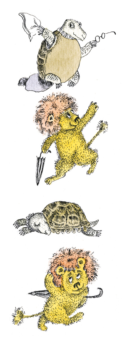 Львёнок подкрался совсем близко, лёг на песок рядом с Черепахой и приподнял одно ухо, чтобы лучше слышать.