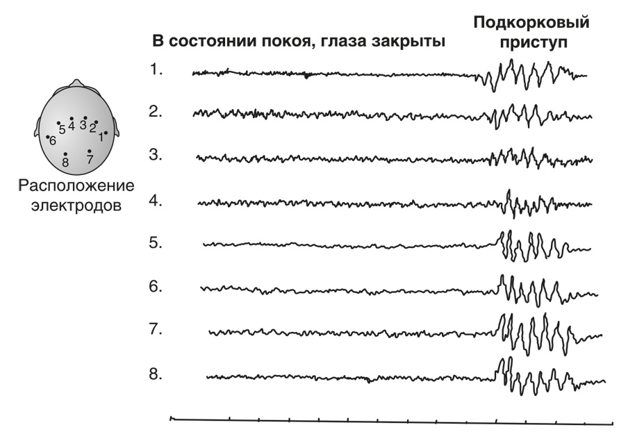 С помощью ЭЭГ выявляли также, что происходит в мозге пациента, подверженного эпилептическим припадкам, которые (так уж повелось испокон веков) рассматривались как нечто мистическое, иррациональное, не поддающееся объяснению. ЭЭГ ясно показала, например, что эпилептический припадок обычно начинается в височной доле левой стороны мозга и оттуда распространяется по всему мозгу, что и являлось причиной проведения операций по рассечению мозолистого тела, о которых упоминалось выше. Суть операции состояла в том, чтобы путем рассечения мозолистого тела ограничить электрическую активность одной стороны мозга, давая возможность другой действовать нормально, причем эта процедура применялась только при очень серьезных припадках. С помощью ЭЭГ удалось установить также, что существует множество различных уровней эпилепсии, и хотя некоторые из них едва заметны для наблюдателя, они тем не менее влияют на самого эпилептика.