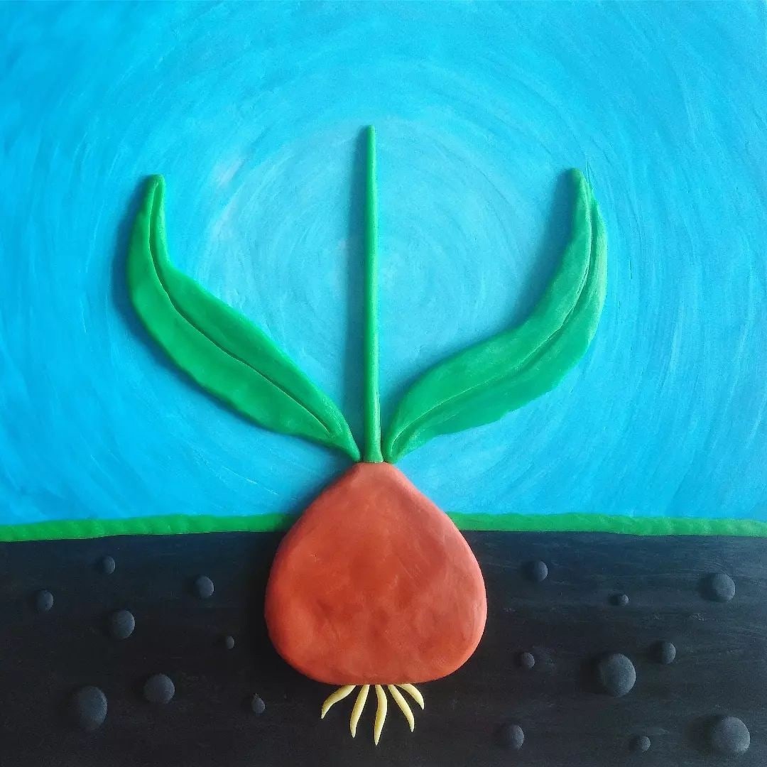 Катаем коричневый шарик для луковки. Расплющиваем его, в процессе формируем необходимую форму. Для маленьких корешков я смешала в равных пропорциях немного белого и жёлтого пластилина, скатала несколько тонких колбасок и прикрепила к луковке.