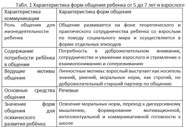 Одновременное изменение потребностей, мотивов и средств общения детей ведет к изменению форм коммуникативного развития. Они определяются пятью параметрами: временем возникновения, функциями общения, основными потребностями в общении, доминирующими мотивами общения и главными средствами общения. Характеристика форм общения ребенка от 5 до 7 лет и взрослого представлена в табл. 1.
