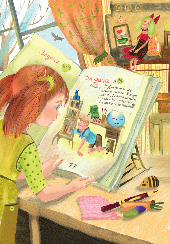 Аля раскрыла учебник так, наугад, где сам раскрылся. Прочла: «У Антоши на столе было девять солдатиков. Один барабанщик, остальные пехотинцы. Сколько было пехотинцев?»