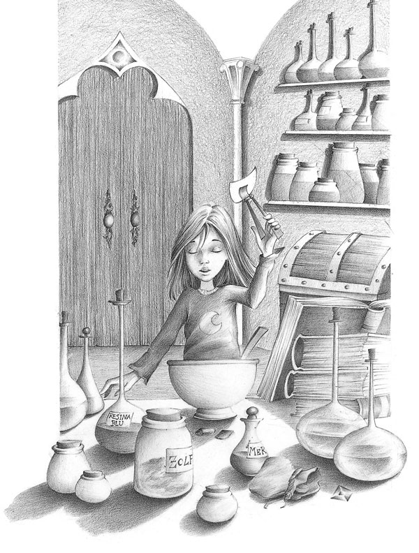 По правде говоря, даже в Мадриде под четким руководством профессора Хосе, ей никогда не приходилось делать такие сложные алхимические составы. Боязнь ошибиться была очень сильной, но, собравшись с духом, Нина взяла мешочек и развязала его. Внутри лежали тридцать три металлические пластинки. Она осторожно сложила их в белую плошку, затем обвела глазами полки, уставленные рядами банок с этикетками. Они были расставлены строго по нарастанию интенсивности цвета. Нина нашла банку с серой, выше стояла колба с живой ртутью, на нижней полке шкафа девочка увидела длинную с узким горлышком бутылку с синей камедью. Оставалось найти Зуб Дракона. Ни в коробках, ни в ящиках лабораторного стола нигде его не было. Но на полке маленького камина с неугасимым огнем она заметила желтую пирамидку высотой около полуметра из твердого грубого материала. На плоскости, обращенной к стене, была надпись: «Дракон». Вершина пирамиды была закупорена пробкой, и, открыв ее, на дне Нина увидела накрытые пучком соломы восемь огромных желтых с серыми пятнами зубов.