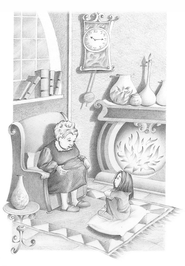 Внезапно она почувствовала, как некая странная сила потащила ее к спальне деда, а оттуда к Зеркальной Комнате. Остановившись перед закрытой дверью, девочка достала ключи, и тот, что напоминал полумесяц, лег в ее руку. Она вставила ключ в замочную скважину и дверь открылась.