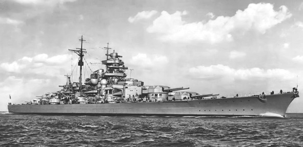 Линейный корабль «Бисмарк» (Bismarck) на момент вхождения в строй 20 августа 1940 года был самым крупным (наибольшая длина 250.5 метра, максимальное боевое водоизмещение 50 900 тонн) и мощным надводным боевым кораблём германского флота (8 380-мм орудий главного калибра в четырёх башнях, 12 150-мм орудий противоминной артиллерии) с экипажем из 2065 человек.
