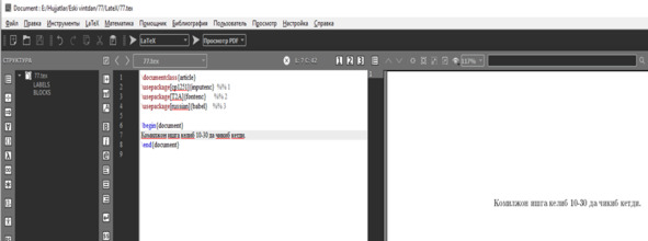 TeXMaker interfeysini matn va buyruqlar maydoniga quyidagini tering: