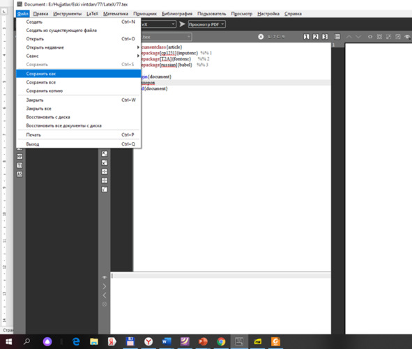 1. TeXMaker dasturini ishga tushiring va \documentclass {article}, \begin {document} va \end {document} buyruqlari asosida ixtiyoriy besh qator lotin alifbosidagi matnni kiriting, malim nom bilan saqlang va kompanovka qilib jarayonni borishini kuzating.