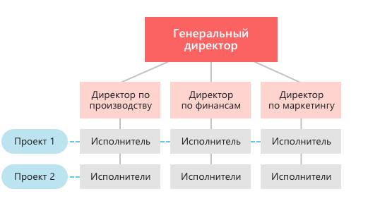 Это комбинация продуктовой (дивизиональной) и функциональной структур. Самая сложная структура. Отличительная особенность подчинение сотрудников двум и более руководителям одного уровня.