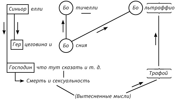 д) Весьма необычен вид связи, возникшей между искомым именем и вытесненной темой (смерти и сексуальности и т. д., в которой встречаются названия Босния, Герцеговина, Трафой). Включенной здесь схемой, заимствованной из статьи 1898 года, я попытаюсь наглядно изобразить эту связь.