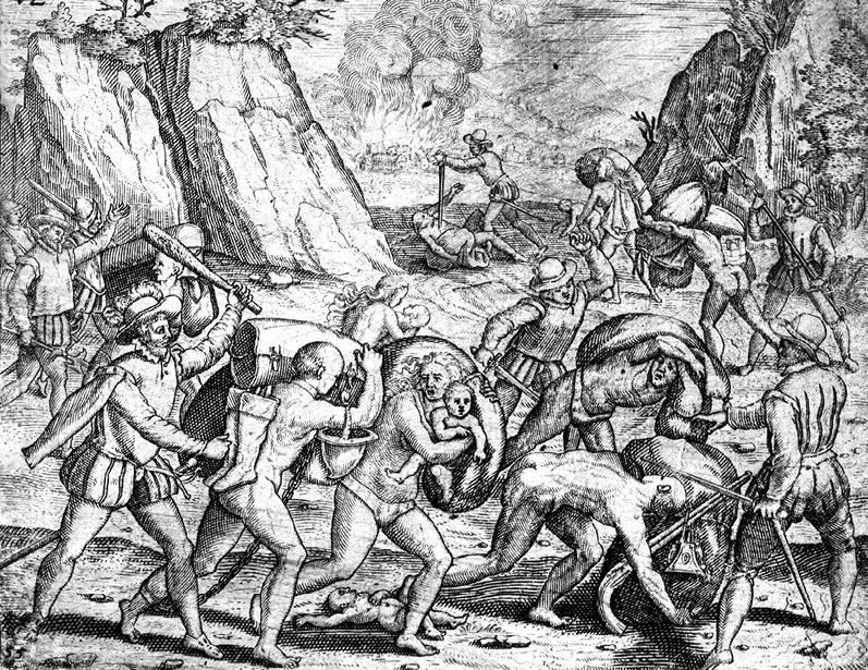 Теодор де Бри. Испанские конкистадоры обращают в рабство индейцев. Из книги Бартоломе де лас Касаса «Кратчайшая реляция о разрушении Индий». 1522