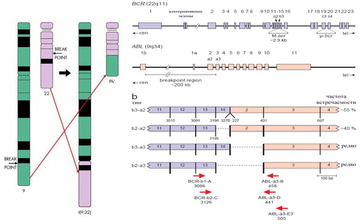 Патогенез ХМЛ хорошо изучен. В 1960 г. в г. Филадельфия (США) P. Nowell и D. Hungerford впервые обнаружили у больного ХМЛ хромосомную аномалию укороченную хромосому 22, впоследствии названную филадельфийской [6]. Это наблюдение в последующем привело к открытию ключевого момента в патогенезе ХМЛ образования химерного гена BCR::ABL продукта обмена генетическим материалом между 9 и 22 хромосомами. При этом в результате слияния двух нормальных генов образуется новый ген, продуцирующий патологический белок, имеющий в 1000 раз более высокую тирозинкиназную активность, чем его нормальный предшественник [7].