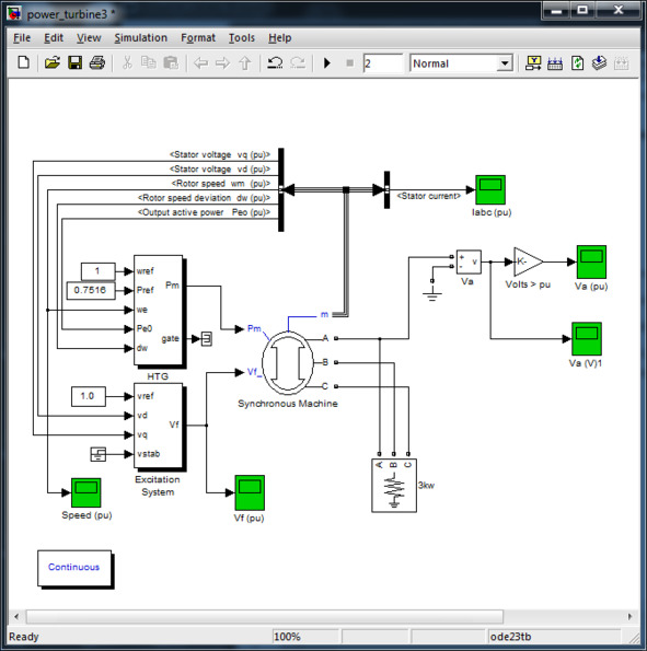 The microelectric power plant model consisting of a hydraulic turbine and a synchronous generator is shown in Fig.1. The Hydraulic Turbine and Governor (HTG) unit is a model of a hydraulic turbine with a control system. The control system includes a proportional differential (PID) controller and a control servo motor [1]. The general scheme of the model is shown in Fig. 2.