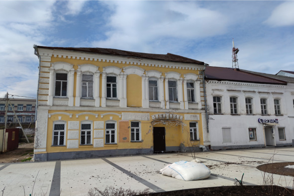 Рядом, слева, Вечный огонь, а за ним еще один храм. Это двухэтажная церковь Введения во храм Пресвятой Богородицы, возведенная в 1762 году, но неоднократно горевшая в XIX веке, вследствие чего верхний этаж с колокольней был уничтожен, но возобновить его так и не решились: то ли денег не было, то ли руки не дошли, а там и революция подоспела с ее катаклизмами. В наши дни строительной пленкой лишь лицевой фасад убран, все остальное на глазах ветшает, хотя лет десять назад, судя по старым фотографиям, вид храма был значительно лучше. Аналогичная ситуация с расположенными подле, через площадь, купеческими (торговыми) рядами: краснокирпичные остовы с выгоревшей сердцевиной и убогая видимость реставрации за счет натянутых полотен, имитирующих декор стен.
